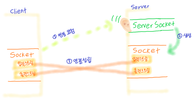 서버 소켓은 소켓 간의 연결만 처리하고 실제 데이터는 소켓들끼리 서로 주고받는다. 소켓들이 데이터를 주고받는 연결통로는 바로 입출력 스트림이다. [자바의 정석]
