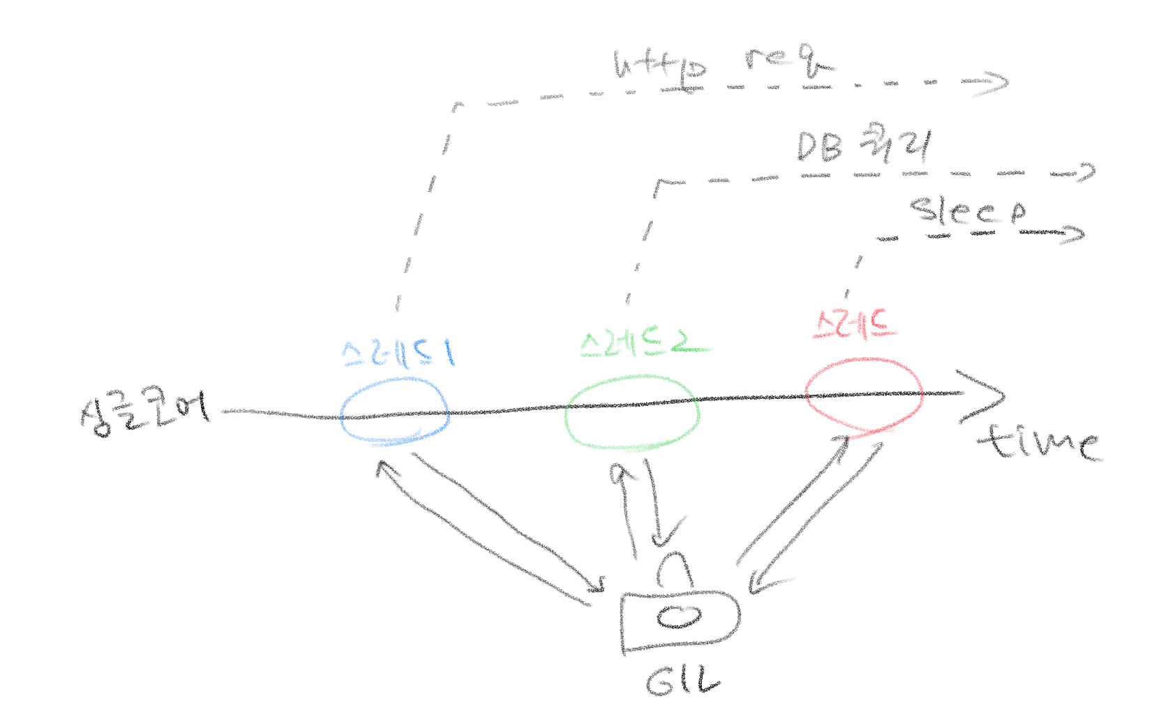 한 스레드에서 sleep 실행하면 GIL을 release해서 그동안 다른 스레드가 실행될 수 있도록 한다.