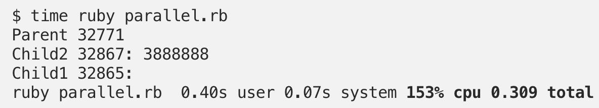 프로세스 fork떠서 child process 2개에서 각자 코드 블럭 실행. parent process는 Process.wait으로 자식 프로세스들 모두 종료될때까지 기다리기.