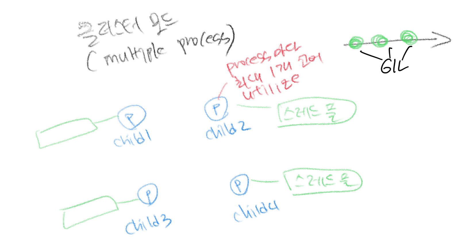 - GIL(global interpreter lock) 때문에 Ruby MRI(= CRuby)에서는 single-core 보다 많이 utilize하는 유일한 방법은 프로세스이다.