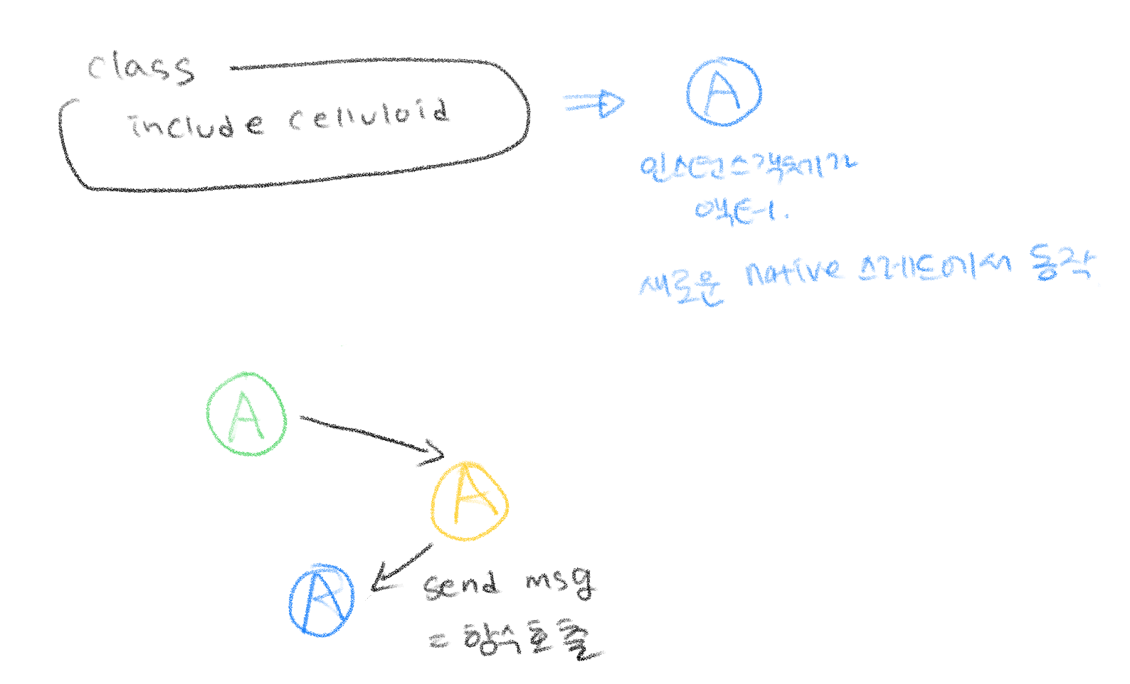 액터 모델에서는 서로 msg sending을 통해서만 소통하는데, celluloid에서는 함수 호출이 msg send하는 액션에 해당함.