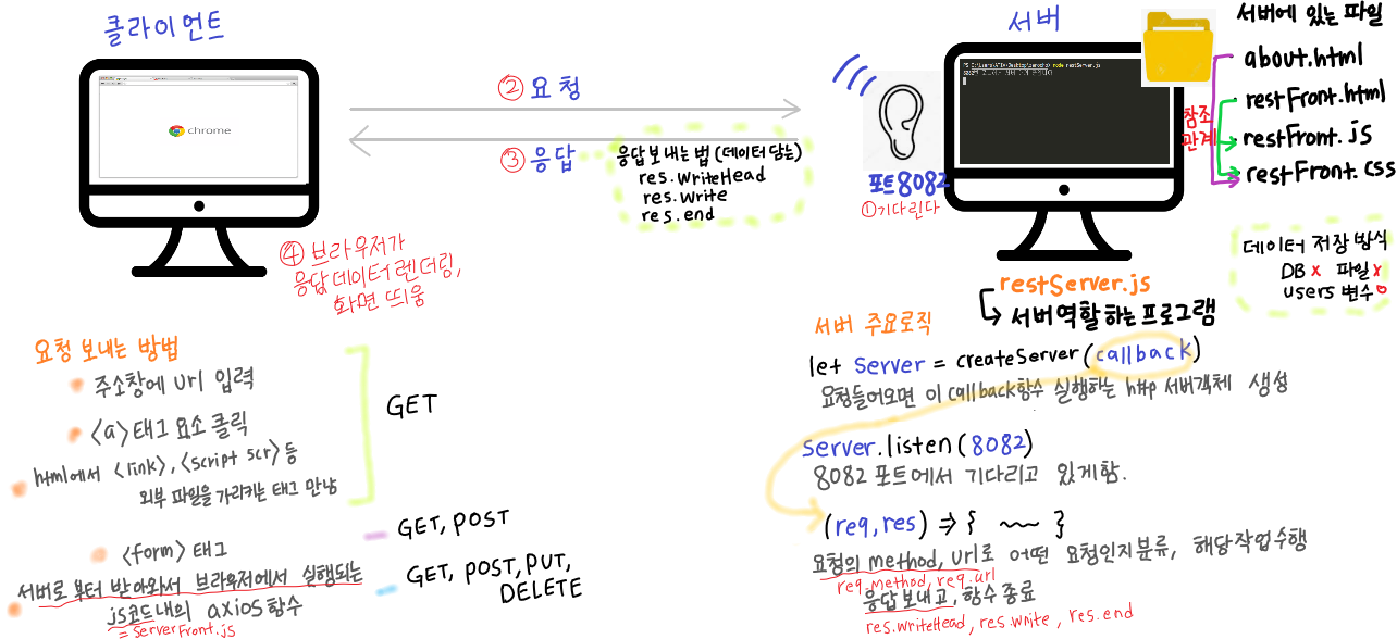 클라이언트 역할 프로세스 : 브라우저(?) (restFront.js 코드는 이 브라우저 위에서 실행된다. 실행 환경이 브라우저)