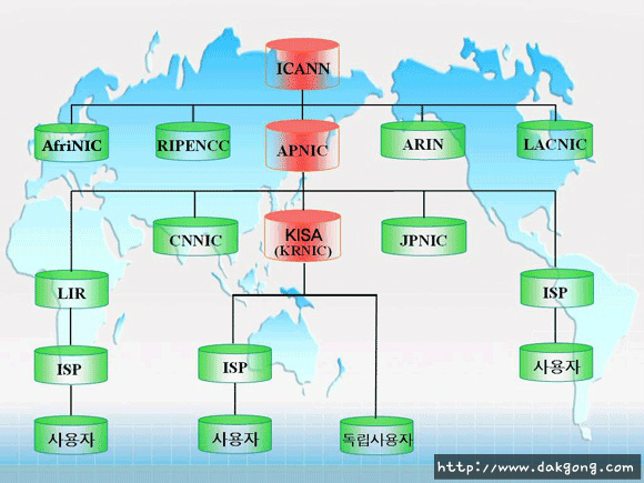 - 비영리 법인 ICANN 내의 한 기능인 IANA가 이 업무를 수행.